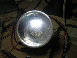 | displayed the device innards. 3 wires from the power supply attach to the circuit board. The LEDs are mounted on the circuit board in sets of 8 or 10, with traces connecting the banks of LEDs that are wired in series. |
